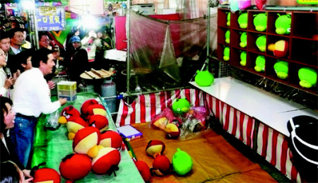 馬英九(左)昨晚在嘉義夜市手拿“憤怒鳥”投擲綠色小豬,“三只小豬”應聲倒地,馬英九振臂為自己喝采。(圖片來源于:臺灣《聯合報》)