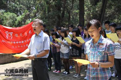 中國臺灣網7月12日平頂山消息 “大江東去,浪淘盡,千古風流人物,故壘西邊,人道是,三國周郎赤壁,……”這不是教室學生們的讀書聲音,它是兩岸青年學子在“三蘇墳”前齊誦蘇東坡著名的《念奴嬌·赤壁懷古》。7月11日,2012年“豫見歷史——兩岸青年中原文化研習營社會實踐分營”一行走進平頂山郟縣三蘇園,在這里舉行了一場別具風格的兩岸青年文化交流活動。