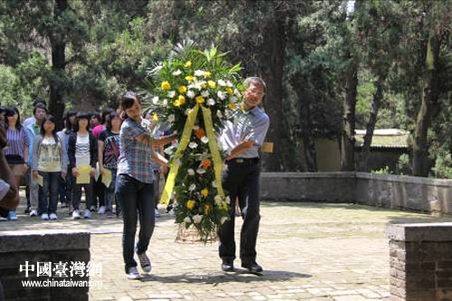 臺灣大學生領隊向“三蘇墳”敬獻花籃。(圖片來源:河南省臺辦)