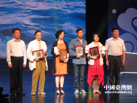國(guó)臺(tái)辦副主任葉克冬及海南省委副書記李憲生為獲獎(jiǎng)詩人頒獎(jiǎng)。左起:葉克冬、羅門、舒婷、潘維、顏艾琳、李憲生。(中國(guó)臺(tái)灣網(wǎng) 薛白璐 攝)