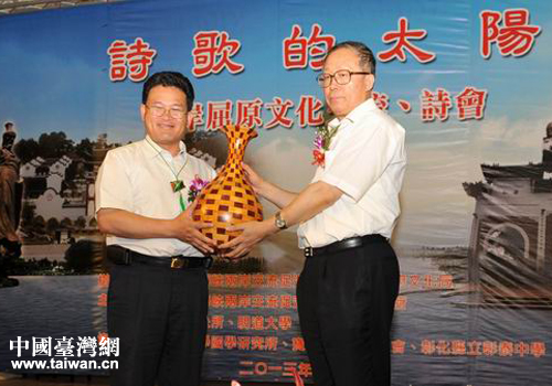 5月30日,李鴻忠在彰化市彰泰中學(xué)出席《詩歌的太陽》詩會(huì),會(huì)見彰化市長邱建富先生,互贈(zèng)禮品。(圖片來源:湖北省臺(tái)辦)