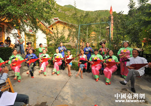 在菜園村,果樹林立、鮮花掩映、整潔優(yōu)美、民族特色鮮明的環(huán)境給兩岸媒體記者留下了深刻印象。記者們走進(jìn)村寨采訪10戶村民以聯(lián)戶經(jīng)營模式發(fā)展農(nóng)家樂的故事,欣賞藏羌特色刺繡和極具當(dāng)?shù)孛褡逦幕厣墓?jié)目表演,特別是國家級(jí)非物質(zhì)文化遺產(chǎn)南坪曲子傳承人黃德成及當(dāng)?shù)厝罕姽餐瑥棾硌莸哪掀呵幼尨蠹屹澆唤^口。(中國臺(tái)灣網(wǎng)、四川省臺(tái)辦聯(lián)合報(bào)道)