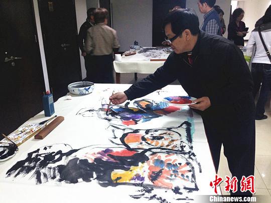 北京臺(tái)灣藝術(shù)交流座談會(huì)10月31日舉辦,兩岸藝術(shù)家交流經(jīng)驗(yàn),現(xiàn)場(chǎng)揮毫潑墨。圖為臺(tái)灣藝術(shù)家現(xiàn)場(chǎng)作畫(huà)。曾鼐攝
