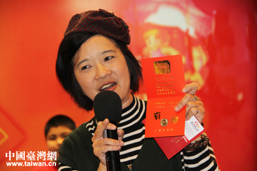臺南文化協會的代表在現場向屬馬的臺胞派發了喜氣洋洋的馬年“紅包”。(中國臺灣網 楊永青 攝)