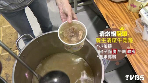 小拉面,過水汆燙20秒馬上撈起,再放進(jìn),帶筋脆彈腱子肉,和口感綿密的牛腩,最后琳上蘋果、西芹、白蘿卜、洋蔥,熬煮的蔬果高湯清燉組第一名,主打清爽口感。臺北牛肉面節(jié)清燉組冠軍業(yè)者高呼:“冠軍牛肉面在這。”