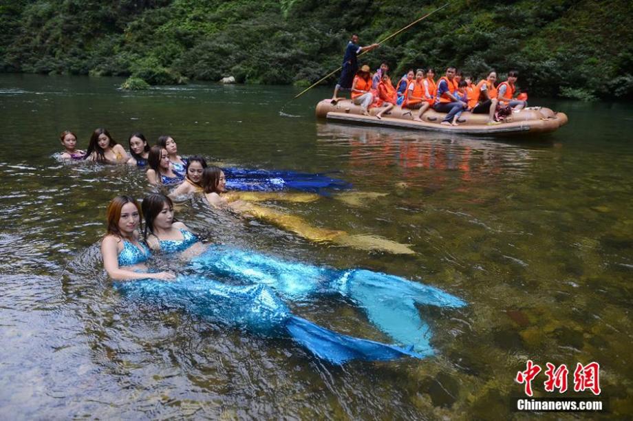 8月4日,湖南永順猛洞河“美人魚”游泳教學開班,眾多喜愛游泳的美女化身“美人魚”,在水中暢游、嬉戲。她們妙曼的身姿和閃亮的美人魚服裝,吸引了許多漂流者的目光。楊華峰 攝