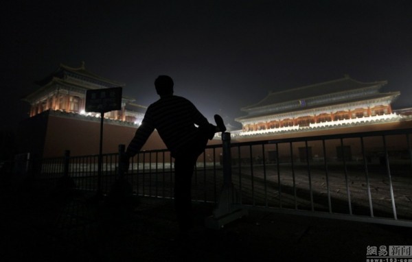 2010年10月7日,北京,一名市民在故宮午門前鍛煉身體。
