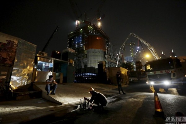 2015年6月24日,北京CBD光華路上,晝夜施工的北京第一高樓“中國尊”工地,一名在夜間下班的工人,準備打開地下管道的水閥洗個臉,然后回工人宿舍休息。