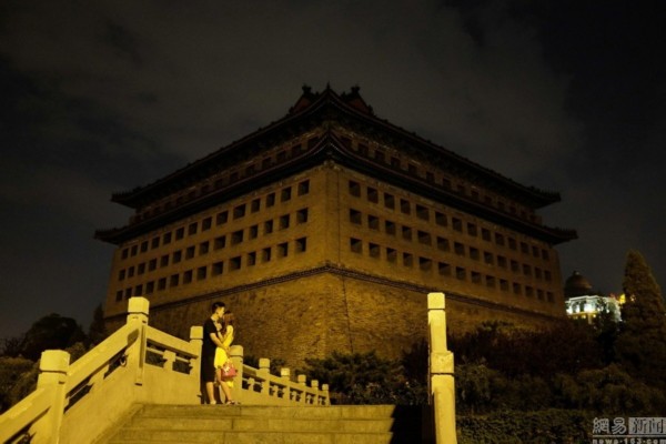 2014年6月12日,夏夜的東便門城樓下,一對戀人在天橋上偎依。