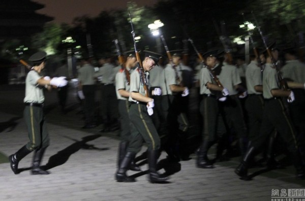 2010年8月31日,北京,負責天安門升降國旗的武警在夜間進行日常訓練。