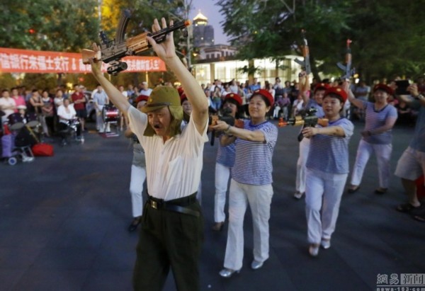 2014年6月29日,北京,大媽在街頭持槍跳“打鬼子”廣場舞,大叔扮鬼子不亦樂乎。