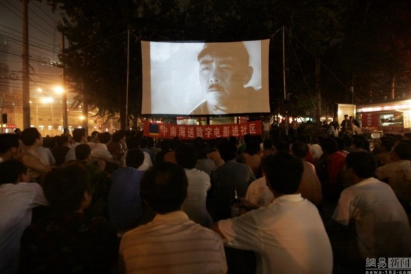 2007年6月6日,夜里的朝陽路上,上百農民工在一個工地附近觀看關于抗日戰爭的露天電影。