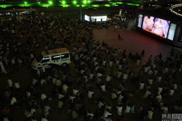 2008年7月6日,北京,乘客們在北京西站的廣場前觀看電影,等待上車。