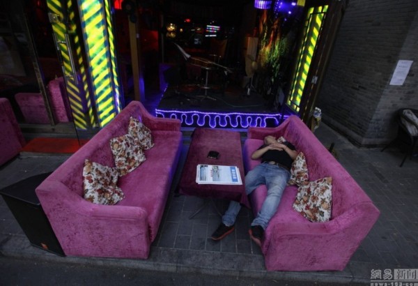 2012年8月23日,北京,一名員工在后海酒吧門前的沙發上睡覺。