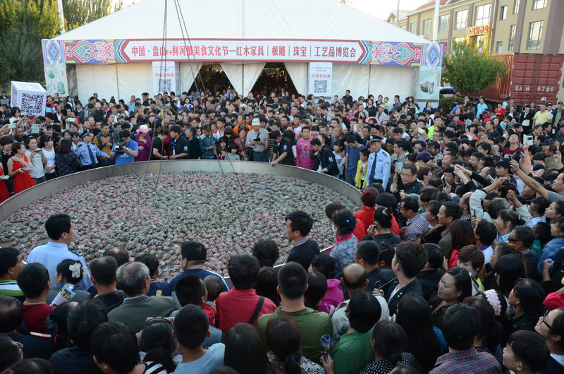 河蟹美食節(jié)開幕現場,最引人注目的無疑是正在申請吉尼斯紀錄的大鍋現蒸萬只河蟹。據了解,該鐵鍋鍋口直徑6.6米,鍋底直徑3.8米,鍋深1.5米,總高2.4米,總容量16.8立方米,不僅是遼代以來有記錄容積最大的鍋,也是已知目前全國范圍內最大的鍋。拇指鍋蓋采用一級紅松板材和方材,蒸屜直徑則達到為5600毫米,現場使用了一噸焦炭對河蟹進行蒸制。