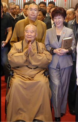 中國網(文化中國)訊:9月21日,臺灣佛光山開山宗長星云大師最新親筆著作《星云智慧》新書發布會在佛光山臺北道場舉行,星云大師特別北上,親臨開示。國民黨臺灣地區領導人參選人洪秀柱女士會前先與星云大師會面,扶著星云大師的輪椅一同進場并同臺就坐。星云大師發表講話力挺洪秀柱,這次代表國民黨出來競選2016,在黨代會上獲得大家支持,“你在我們的心目中,已經當選臺灣地區領導人了”。對于洪秀柱曾經說要做“觀世音,要救苦救難”,星云大師表示“這一句話是偉大的,我感到非常的贊嘆,非常的歡喜”、“媽祖婆是觀世音的弟子”。星云大師同時呼吁,希望臺灣和中華文化能夠接線,讓臺灣永遠與中華文化在一起,都成為佛教的信仰,讓信仰成為我們的力量。隨后,洪秀柱在致辭時表示,她非常高興能受邀出席,并得到星云大師的親筆簽名,自己“何其有幸,非常有福氣”,也謹記大師所說的“三好”、“四給”、“五和”。