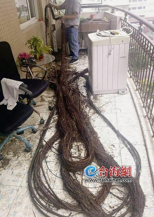 這棵榕樹的生命力真頑強,樹根從19樓順著下水道一直長到4樓。不過,它已經影響到正常生活了,居民只能把它處理掉。