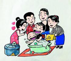 永軍和媳婦是高中同學,媳婦是他們班里最好看的姑娘,性格也特別好。當時,永軍就在心里默默放下狠話,將來一定要讓她出現在自己筆下的全家福中。就這樣,經歷了八年愛情長跑的他們幸福地步入了婚姻的殿堂。從民政局領證回來后,激動的永軍將每年春節的傳統項目畫全家福提前了,連夜就奮筆疾書畫了起來。那張全家福里,披著大紅花的他背著漂亮的媳婦,笑得格外燦爛,而爸媽和弟弟則化身威風鑼鼓隊成員,又是敲鑼又是打鼓,好不熱鬧。