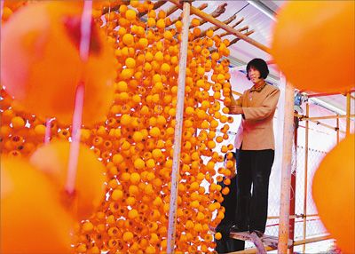 10月25日,山東省沂源縣東里鎮鄭家旺村的農民在對柿子進行刮皮加工。霜降過后,沂源縣的5萬余畝柿子豐收,加工成柿餅后,出口韓國、日本等國家,成為當地農民增收的特色產業。