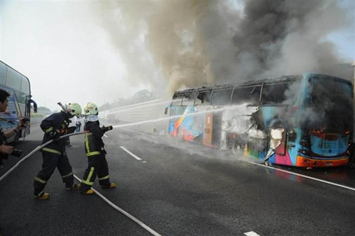 中新網(wǎng)10月27日電 據(jù)臺灣“中時電子報”報道,一輛從新北市南下埔里的游覽車,上午8點半行經(jīng)苗栗縣公館路段時,疑因輪胎過熱起火,整輛車隨后陷入火海,火勢延燒將近1小時,面目全非,所幸司機和33名乘客順利脫困。