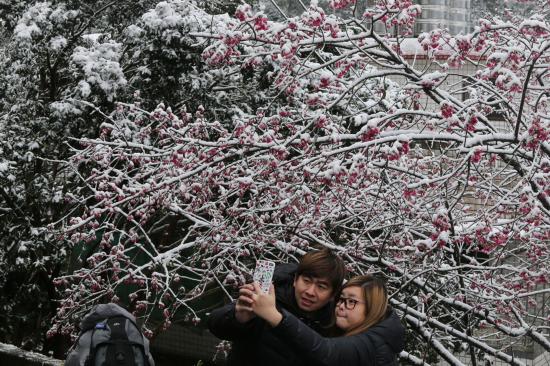 臺(tái)北市陽明山24日積雪深厚,一棵盛開的櫻花被白雪覆蓋,民眾拿起手機(jī)自拍留念。