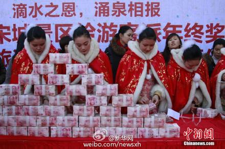 26日,杭州宋城景區給游客派發年終獎。主辦方通過微信征集十位景區游客,在特定區域內限時一分鐘,能抓多少帶走多少。最高一位來自衢州的陸小姐抓到18300元,成為當天抓到最多年終獎的游客。據悉,當天現場現金共有五百萬元。