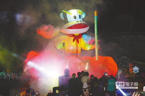 “旋轉大嘴猴”今晚將在臺中公園壓軸開燈,以腳踩筋斗云的霸氣姿態現身,搭配360度旋轉及七彩燈光特效,猶如猴躍星空,意寓“立足臺中、放眼國際”。