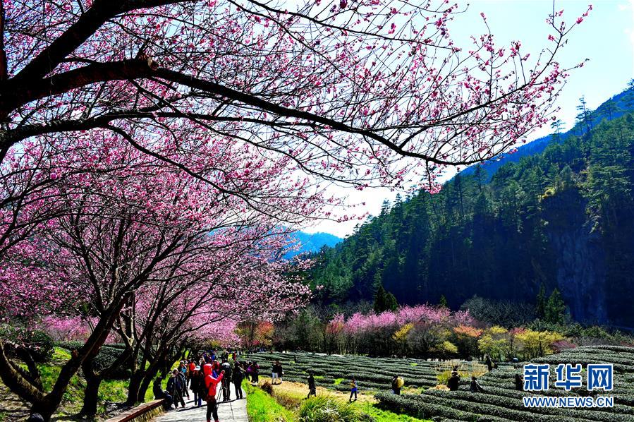 2月29日,游客在武陵農(nóng)場(chǎng)茶園觀賞櫻花。初春的臺(tái)灣,氣溫回升,位于海拔1700多米的臺(tái)中武陵農(nóng)場(chǎng),漫山遍野的櫻花競(jìng)相開放,美不勝收,吸引了四面八方的游客前來觀賞。 新華社記者張國(guó)俊 攝