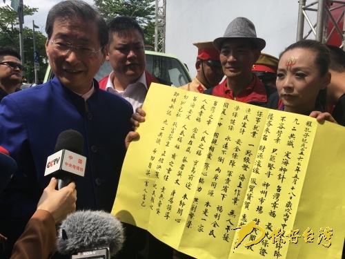 參加活動的新黨代表王炳忠表示,蔡英文當選以來,不斷玩弄文字游戲,不正面回應九二共識,破壞了兩岸之間的政治互信。這樣下去將會把臺灣帶入“無底洞”,“我們這一代年輕人不想再被綁架了,臺灣年輕人要和大陸年輕人一起去創造屬于中國人的未來,我們不再陪她沉淪下去了”。 中國生產黨創黨主席盧月香也代表30多萬在臺灣生活的大陸配偶發出呼吁,“希望民進黨聽到我們的聲音,沒有‘九二共識’就沒有兩岸的和平發展,沒有安定的生活。” 活動上還進行了歌唱舞蹈表演和諷刺劇,張安樂最后帶領群眾將“建言書”送達民進黨。