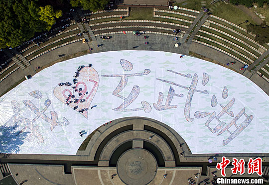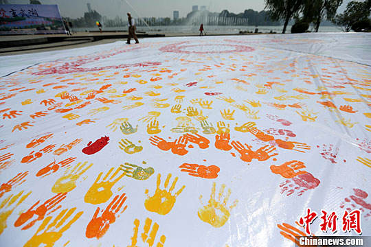 5月19日是中國旅游日,一幅近2000平米的巨幅扇面出現在南京玄武湖蓮花廣場上,通過江蘇廣播FM997金陵之聲征集而來的一百多名志愿者按上彩色手印,用特殊的方式倡議民眾文明旅游,爭做文明旅游人。中新社記者 泱波 攝