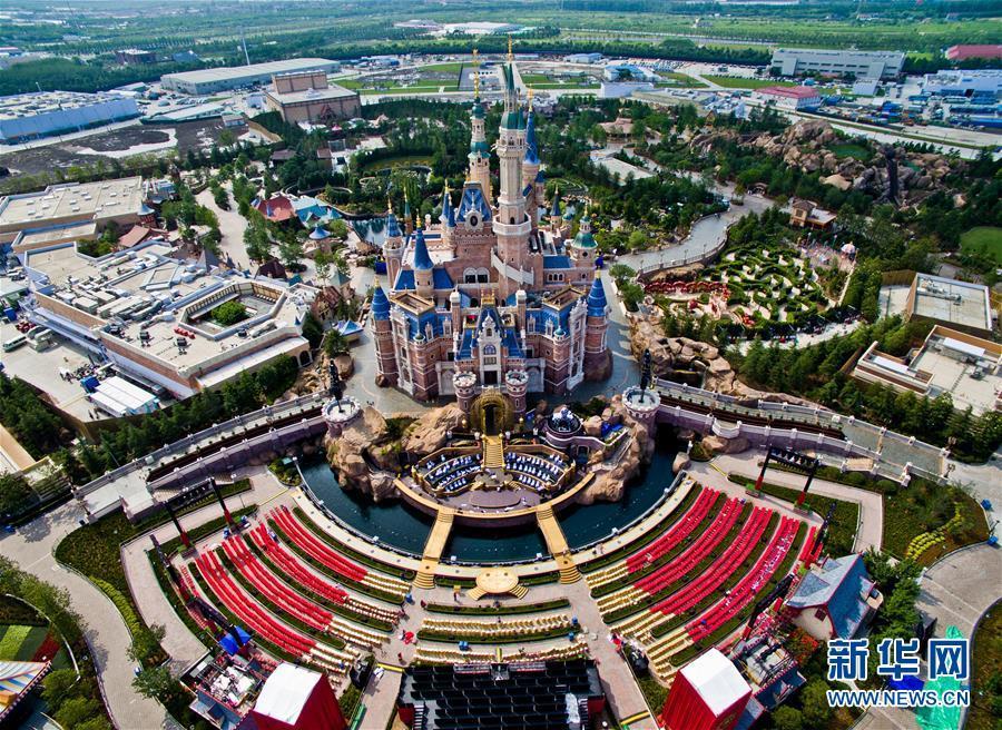 這是6月13日航拍的上海迪士尼開幕慶典主會場。從6月14日開始,上海迪士尼樂園將舉行為期三天的開幕慶典。日前,開幕慶典主會場“奇幻童話城堡”前金色的舞臺和觀眾席已搭設完成。 新華社發 鈕一新 攝 圖片來源:新華網