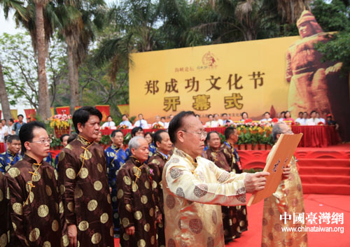 5月17日,來自海峽兩岸的民眾在廈門思明區鼓浪嶼舉行盛大頌典,共祭民族英雄鄭成功。由此,正式拉開了“鄭成功文化節”的大幕。圖為主祭人念祭文。(中國臺灣網 邵磌 攝)