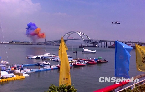 九時五十分許,福建省委常委、廈門市委書記于偉國一聲“啟航”指令,十五艘帆船在海巡艦、海警、直升飛機的引航護航下,成梯隊緩緩駛離五緣灣港,經過高高的五緣大橋,前往比賽起航線大擔島。