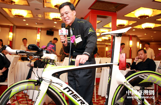 美利達公司總經理許世彥興致勃勃的講解自己公司生產的多功能競賽三鐵競速車。(中國臺灣網 鐘寶華 攝)