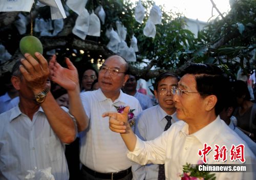 郭聲琨一行的到來受到當(dāng)?shù)孛癖姷臒崃覛g迎。果農(nóng)以一種特別的方式——燃放爆竹來歡迎遠(yuǎn)方的客人。郭聲琨抵達(dá)臺(tái)南縣南化鄉(xiāng)小侖村時(shí)已值傍晚,他深入果園,參觀豐收在望的芒果園,與果農(nóng)親切交流,了解水果產(chǎn)銷情況,并走進(jìn)集貨場,參觀貨場水果分揀,包裝作業(yè)過程,品嘗臺(tái)南水果。