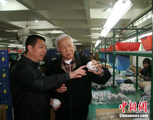 2月15日,在東山椿益塑膠制品有限公司生產(chǎn)車間,72歲的臺(tái)商、公司副董事長呂文吉先生 (右)與技術(shù)員忙著嚴(yán)把產(chǎn)品質(zhì)量關(guān)。