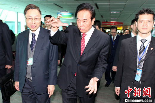 2月23日中午,應臺灣海基會董事長江丙坤之邀,海協會會長陳云林率經貿考察團搭機抵臺,他在回應記者時表示“春天的季節來臺,感覺很好”。圖為桃園機場,陳云林與海基會副董事長高孔廉邊走邊交談。中新社記者 董會峰 攝