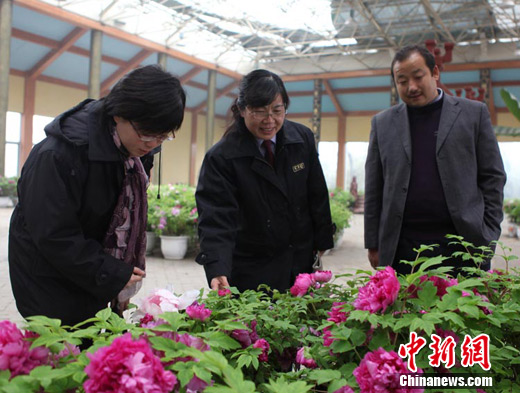 洛陽出入境檢驗檢疫局工作人員正在對參展牡丹生長情況進行觀察。