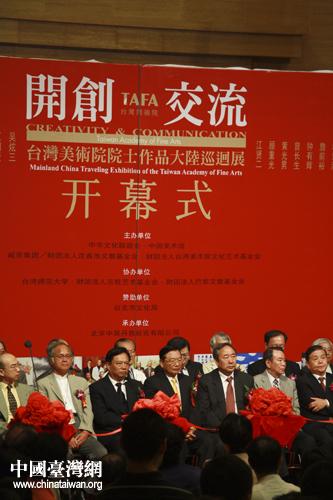 中國臺灣網(wǎng)8月22日北京消息 22日上午,由中華文化聯(lián)誼會、中國美術(shù)館、臺灣沈春池文教基金會、臺灣美術(shù)院文化藝術(shù)基金會主辦的《開創(chuàng)·交流——臺灣美術(shù)院院士作品大陸巡回展》在北京中國美術(shù)館隆重開幕。臺灣;鶗麻L江丙坤、中華文化聯(lián)誼會顧問周和平、全國臺灣同胞聯(lián)誼會會長梁國揚、海協(xié)會副會長王富卿等兩岸各界嘉賓300余人出席了展覽開幕式。