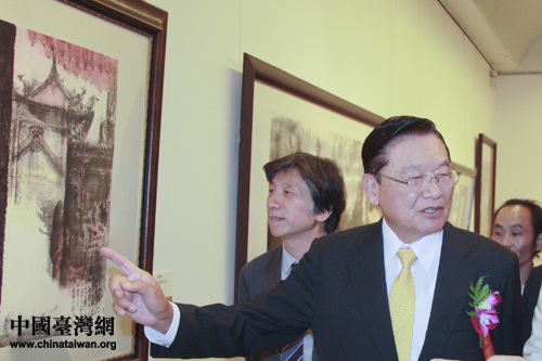 ;鶗麻L江丙坤在臺灣畫家江明賢的國畫作品《北港朝天宮》前,向大陸觀眾介紹臺灣民俗。(中國臺灣網(wǎng) 陳佳慧 攝)