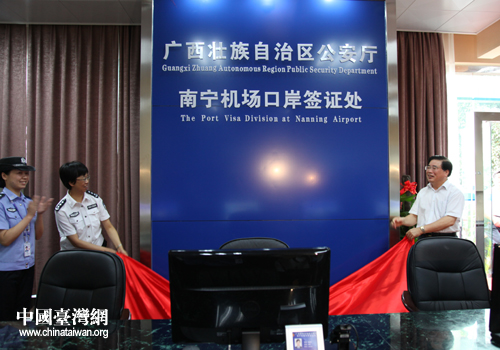 中國臺灣網(wǎng)6月26日南寧消息 日前,臺灣居民口岸簽注啟動暨廣西壯族自治區(qū)公安廳南寧機(jī)場口岸簽證處揭牌儀式在南寧吳圩國際機(jī)場隆重舉行。廣西壯族自治區(qū)副主席、公安廳黨委書記、廳長梁勝利,公安部出入境管理局副局長朱際青等領(lǐng)導(dǎo)出席并致詞。自治區(qū)、南寧市有關(guān)部門領(lǐng)導(dǎo),部分在邕旅行社代表,公安民警代表共250人參加了啟動儀式。