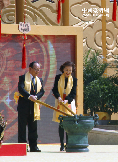 中國國民黨副主席蔣孝嚴及夫人蔣黃美倫首次受邀參加黃帝故里拜祖大典,他們在禮儀小姐的引導下走上拜祖臺,凈手敬香。(中國臺灣網 普燕攝)