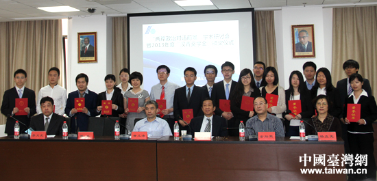 中國臺灣網5月21日北京消息 5月21日上午,由中國人民大學和臺灣漢青兩岸基金會共同舉辦的2013年度“漢青兩岸暨中美關系研究獎學金”頒獎儀式在人民大學明德國際樓舉行,18名兩岸優秀學子被獲予此項殊榮。漢青兩岸基金會創辦人、臺灣中國文化大學美國研究所所長、人民大學國際關系學院客座教授陳毓鈞,國務院臺辦研究局副局長張黎宏,全國臺灣研究會副秘書長楊立憲,中國人民大學國際關系學院院長陳岳等二十余位涉臺專家參與頒獎活動。