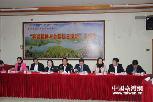 中國臺灣網12月6日廣東蕉嶺消息 在臺灣光復68周年之際,為緬懷臺胞抗日先烈,弘揚愛國主義傳統,由中華全國臺灣同胞聯誼會、臺灣抗日志士親屬協進會、廣東省臺灣同胞聯誼會主辦,廣東省蕉嶺縣人民政府承辦的“客家精神與臺胞抗日運動”座談會,12月6日在臺胞之鄉蕉嶺縣隆重舉行。
