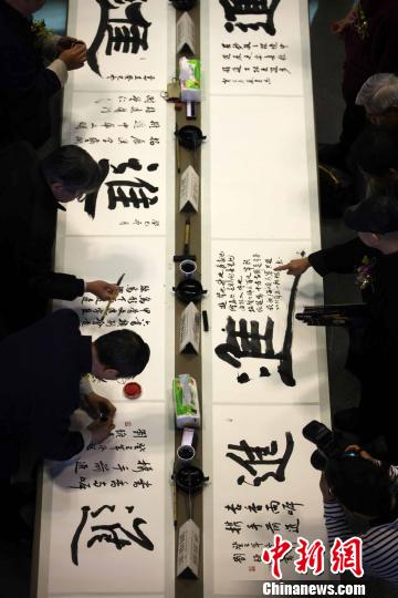 圖為閩臺(tái)知名書(shū)法家現(xiàn)場(chǎng)書(shū)寫的“進(jìn)”字!《瓡(huì)峰 攝