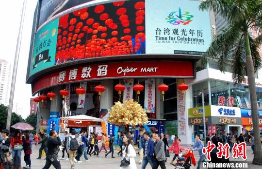 2月15日至28日,在深圳華強(qiáng)北賽博廣場及東門金世界百貨外的兩塊大型戶外LED屏幕,民眾可看到以“臺灣觀光年歷”各式節(jié)慶活動為主題的赴臺游相關(guān)宣傳信息。