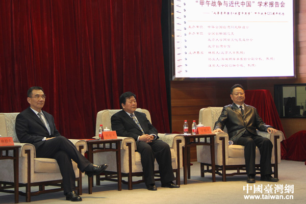 中華全國臺灣同胞聯誼會于2月28日下午在北京臺灣會館舉辦“甲午戰爭與近代中國”學術報告會。圖為三位主講嘉賓。(中國臺灣網 高斯斯 攝)