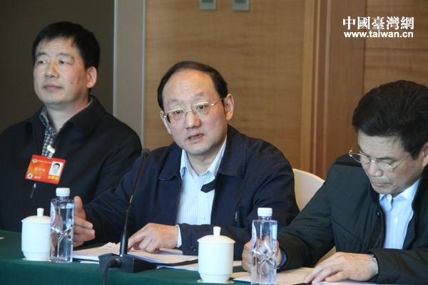 全國政協第十二屆二次會議的分組討論中,臺籍委員江利平正在發言。(中國臺灣網 張潔 攝)