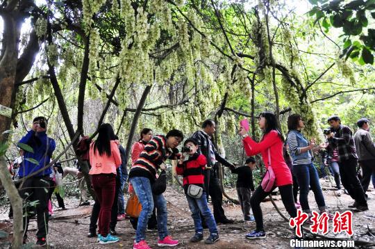 廣東東莞清溪鎮(zhèn)第四屆賞花行16日拉開帷幕,活動吸引了來自粵港臺兩岸三地的游客前來踏青賞花。圖為游客登山入林賞禾雀花。 李獲 攝