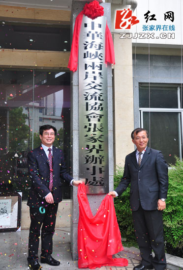 自去年4月15日張家界——臺北直航以后,張家界市促進海峽兩岸交流合作再添一大盛事,4月11日上午,中華海峽兩岸交流協會張家界辦事處正式揭牌成立,市委副書記范運田、中國國民黨副主席蔣孝嚴辦公室主任詹清池共同為張家界辦事處揭牌。